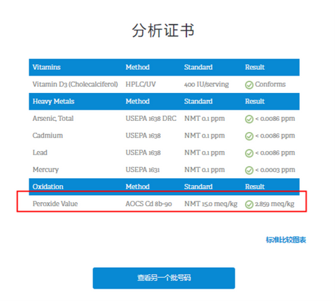 下面的图1是婴幼儿维生素D3网上产品分析证书的一则示例。以红框标出的值是过氧化值 (Peroxide Value, PV)。我们坚持非常严格的标准,每公斤不超过 (No More Than, NMT) 15 meq(参考的是美国油脂化学会AOCS Cd 8b-90官方分析方式)。图中产品批次的过氧化值为每公斤2.859 meq,比规定的合格过氧化值标准低5倍。