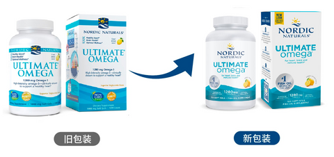 您可以在下方看到我们新旧产品包装对比示例 (终极 Omega 鱼油):