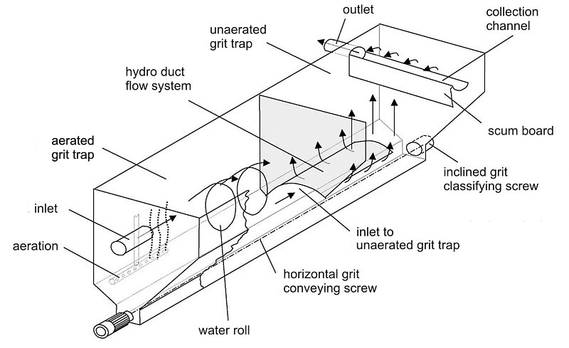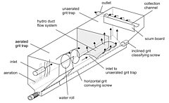 Due to the large surface in the unaerated chamber all dispersed coarse grease particles rise to the water surface in this chamber and mix with the foam of the aerated chamber. A scum board is installed in front of the outlet to prevent drifting off of the floating matter that accumulates in front of the scum board. From time to time, an integrated automatic grease scraper carries the floating material into a grease chamber (see fig. 2). An eccentric screw pump is installed below the grease chamber and conveys the contents into a separation/grease tank or into a raw sludge chamber. Integrated grit conveying and grit classifying screws dewater the separated grit trap material and transport it towards the discharge where the material is dropped either into a container or an appropriate downstream grit washer.