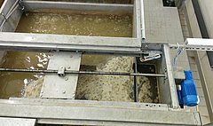 The aerated chamber is followed by an unaerated chamber in which laminar flow conditions prevail. Both chambers are separated by a scum board. A high separation rate of > 95% of the grit fraction size 0.20 – 0.25 mm is achieved without problems in this chamber through exactly defined velocities. The relative velocity is set to ensure that the majority of organic particles is still transported out of the grit trap plant along with the wastewater.