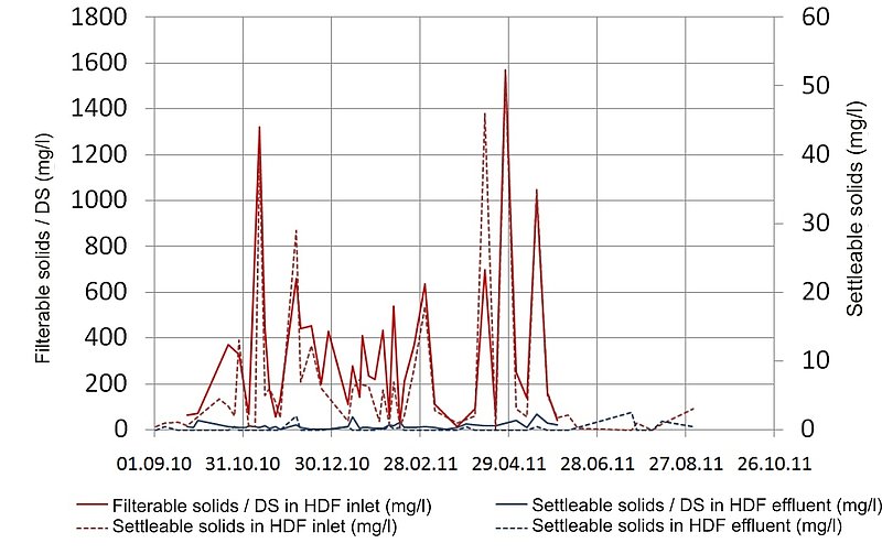 The effluent from the flotation plant, which is virtually free of solids, is collected in a storage tank from where it is passed to the biological treatment system, the membrane bioreactor. The nitrification tank, installed downstream of the denitrification stage, is aerated by membrane aerators mounted on the tank bottom. The effluent from the nitrification tank flows by gravity into the filtration tank with the membrane module where the permeate is discharged at intervals by a submerged rotation membrane (vacuum rotation membrane) with a membrane surface of 108 m². The rotating membranes are the core part of the MBR system. Their rotation, combined with scouring air being introduced from the rotation axis, ensures increased removal of solids from the membrane surface and reduces the energy required for scouring air as the air is blown in at half depth. The MBR plant achieves high clarification efficiency with continuously low concentrations of below 70 mg COD/l. Due to this high effluent quality the treated water is suitable for further treatment or reuse.