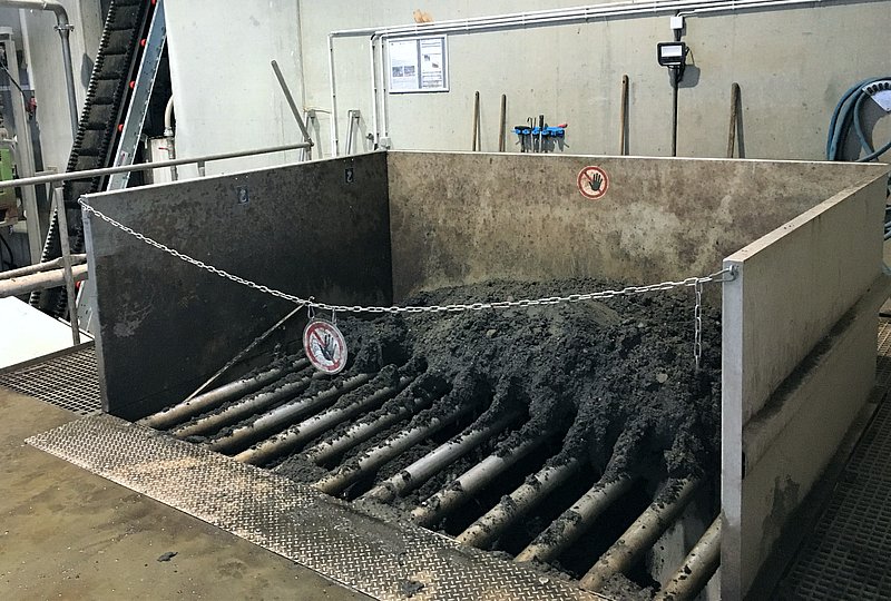The HUBER Grit Dosing Screw RoSF7 integrated in the receiving bunker feeds the material fully automatically into the HUBER Wash Drum RoSF9. In the wash drum, the fraction < 10 mm is washed out by homogenisation. Coarse material > 10 mm is separated by the inclined screening drum, statically dewatered and discharged into the customer’s bin. In addition, a magnet is provided for the separation of metals. Both operators dispose of the coarse materials, and the metals are sold after pre-sorting.