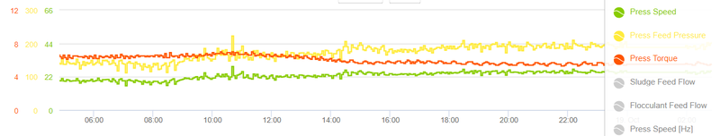 Signal curves on the same installation with new control mode: the degree of dewatering is on average 2 percentage points higher at the same feed rate.