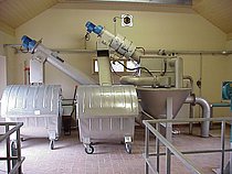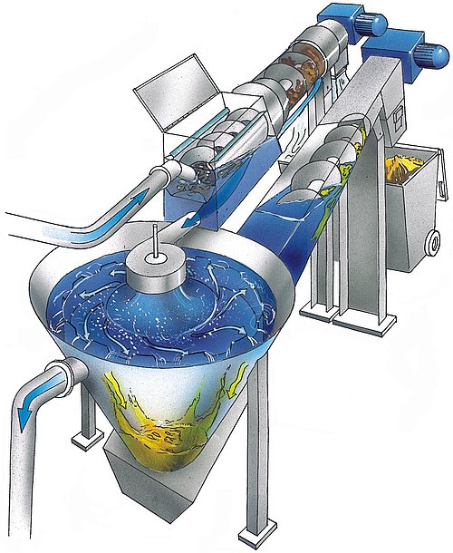 通过运输螺杆可将筛渣物质排出装置。在封闭型提升螺杆区域内,筛渣可在内置型压榨区域受到脱水和压榨处理,然后排入集装箱。