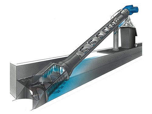 ROTAMAT® 过滤螺杆 Ro 9 按照独特方式工作,可将筛渣过滤,洗涤,运输,压榨和脱水功能集中在一台装置内完成。根据所选择的筛距/孔径 和机械规格 (筛筐直径最大可达 700 mm),可以适合于各种应用场合和处理流量。机械既可安装在箱体之内,也可直接安装在水渠内。
