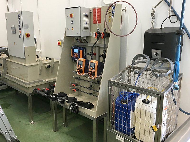 The new DAF installation with HUBER Dissolved Air Flotation Plant HDF includes coagulation with PAC, pH correction with caustic and flocculation with a dilute polymer made up automatically by the batching system.