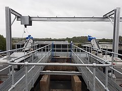 The tank mounted screen were mounted alongside the existing channel retaining the original upstream balancing tank. Flow from the balancing tank then flowed to each of the two screens whilst maintain a bypass channel between the screens if it was required.